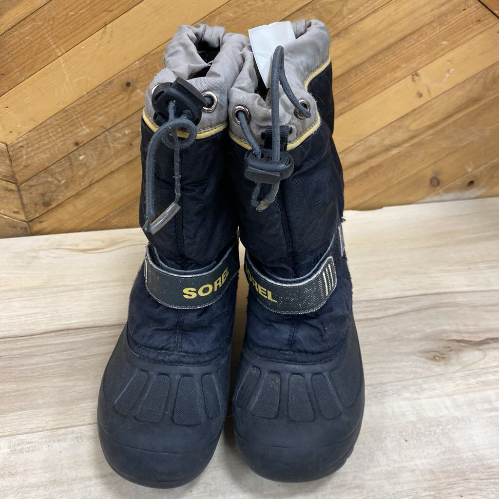 Durable and insulated Sorel winter boots designed for children, perfect for snowy weather. Features a lightweight and waterproof exterior with a secure fit strap for comfort.