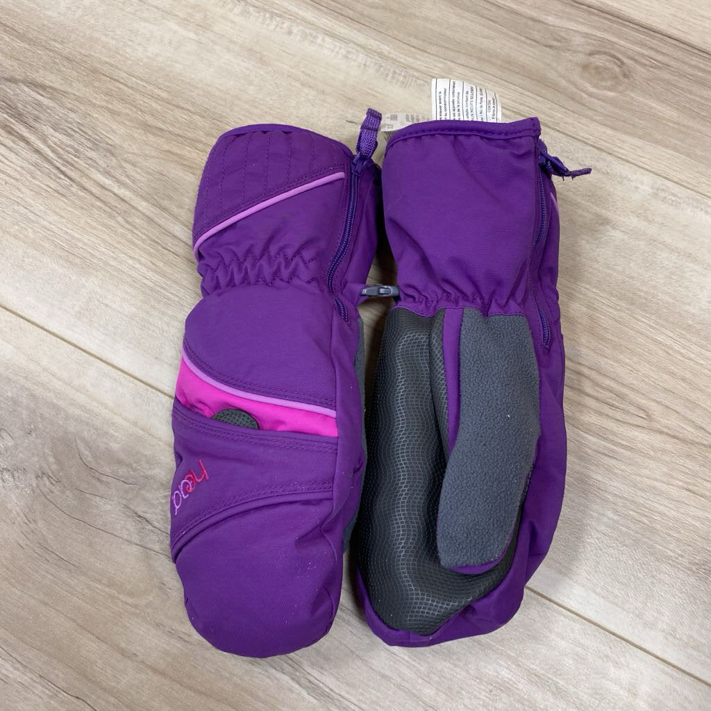 Warm and insulated purple mittens designed for children, featuring pink accents and a secure fit.