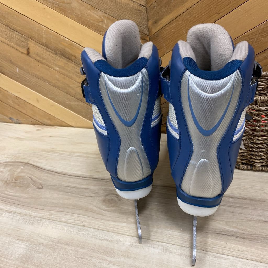 Used blue and white ice skating boots, suitable for adults, ideal for skating enthusiasts.