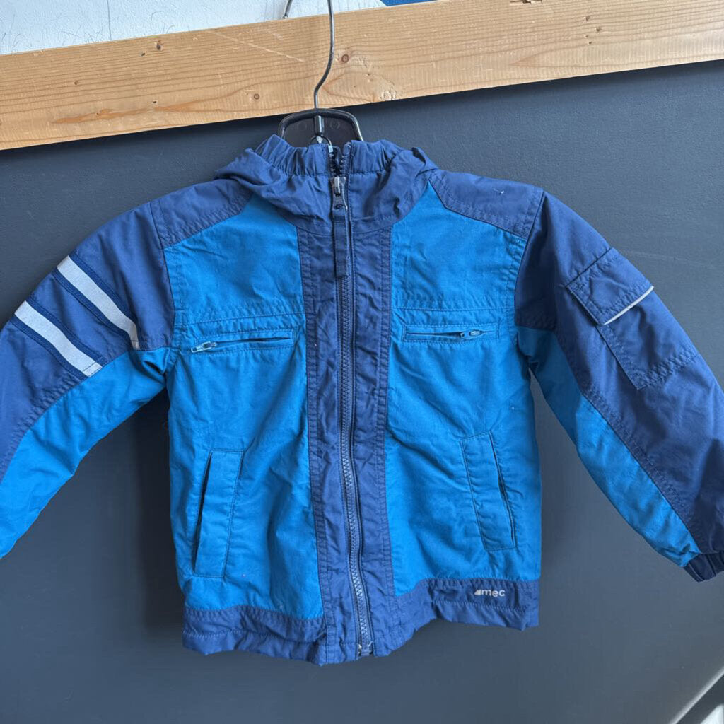 A warm and stylish MEC children's jacket perfect for winter adventures. Features a cozy hood and multiple pockets for practical use.