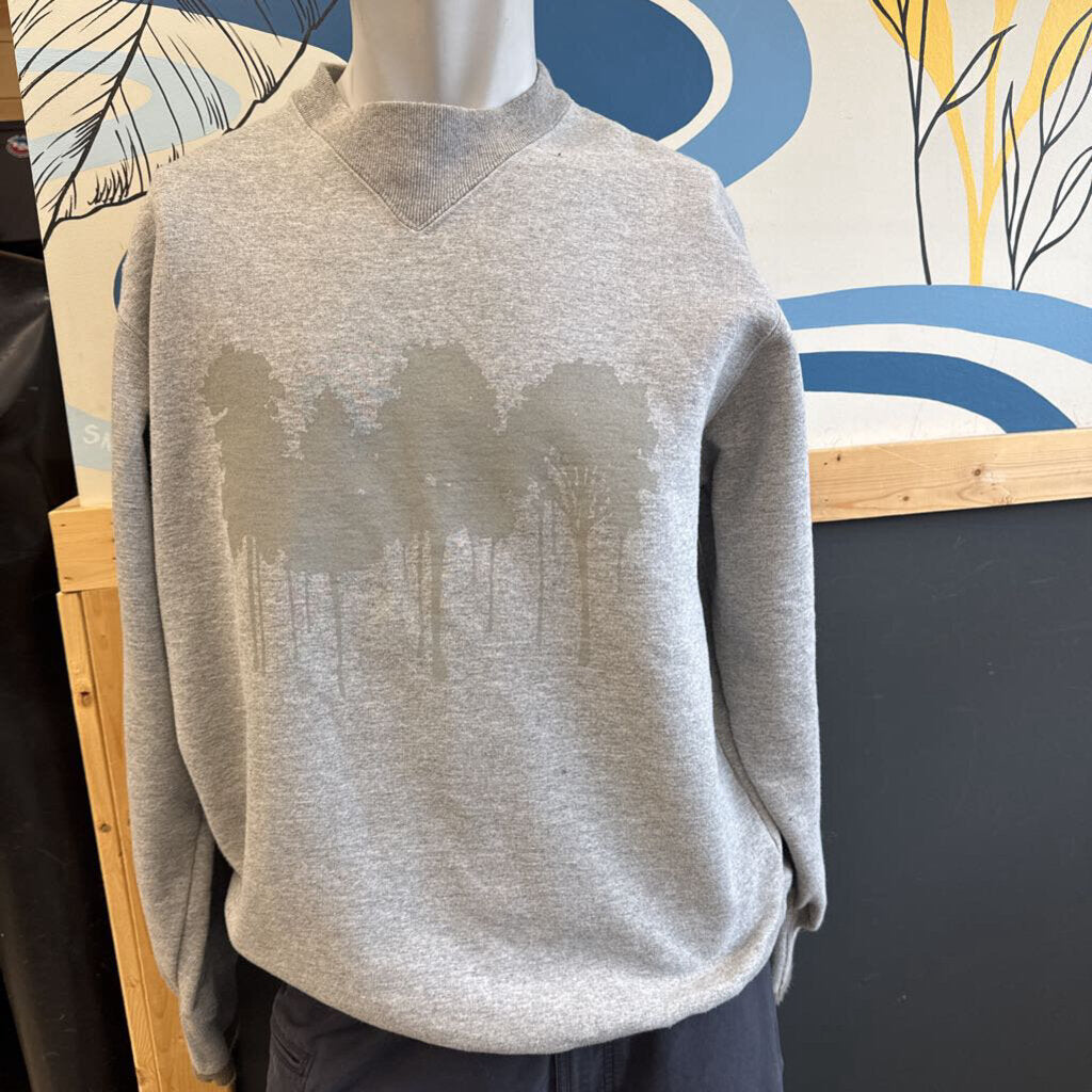 A comfortable gray sweatshirt featuring a subtle tree design, perfect for casual wear during cooler months.